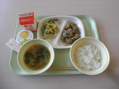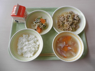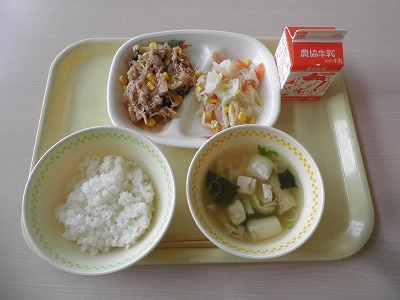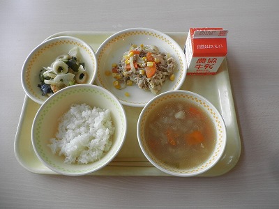 【A食】ご飯 焼肉風炒め物 ごま和え ベーコンとコーンのスープ |