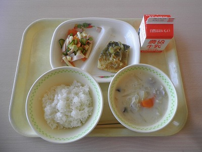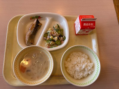 【B食】ご飯 鯖の味噌マヨネーズ焼き 打ち豆サラダ 豆乳スープ |