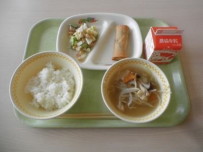 【B食】ご飯 春巻き 大豆のサラダ きのこ味噌スープ |