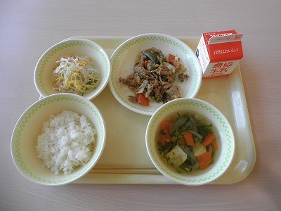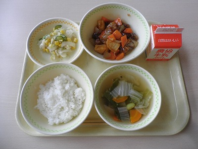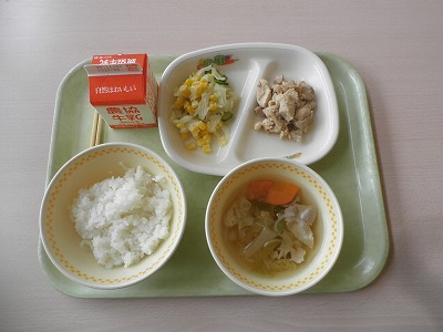 【A食】ご飯 焼肉風炒め物 ごま和え ベーコンとコーンのスープ |