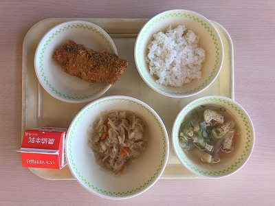 【A食】ご飯 サーモンフライ 切干大根と打ち豆の煮物 かぶの味噌汁 |
