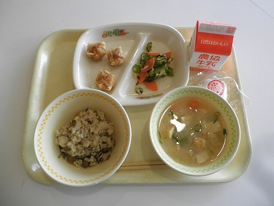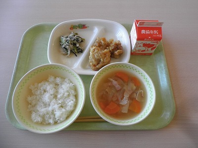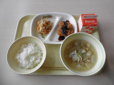 【A食】ご飯 チキン南蛮 切干大根と小松菜のごま和え 打ち豆のスープ |